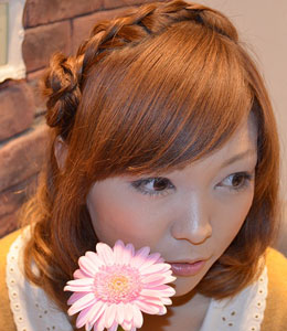 顔まわりからバックにかけて編みこみをして残った髪をルーズにねじってピンで固定します。 |